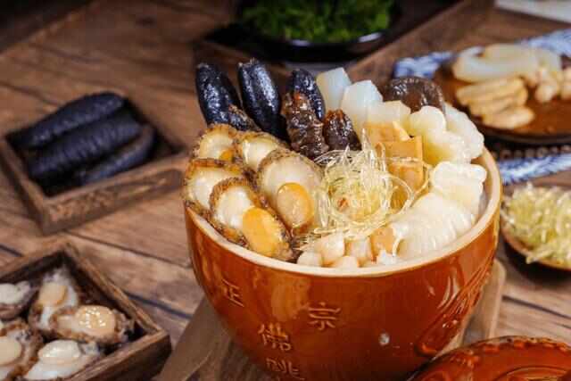 佛跳墻福建名菜之首,是福建非常有名的一道特色菜,[bai]現(xiàn)在是著名的國(guó)宴主菜之一。這道美食匯聚了福建地域的精華,以鮑魚(yú)、海參、魚(yú)唇等海鮮為主料,輔以冬菇、冬筍等蔬菜,用花膠、蹄膀等高湯慢火熬制,口感濃郁,回味無(wú)窮。