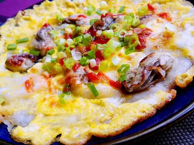 蚵仔煎源自福建泉州,是以鮮嫩的蚵蜊為主料,加入雞蛋、淀粉、蔥花等調(diào)成面糊,用平底鍋煎制而成??诟兴执啵买埘r美,是一道美味的小吃。